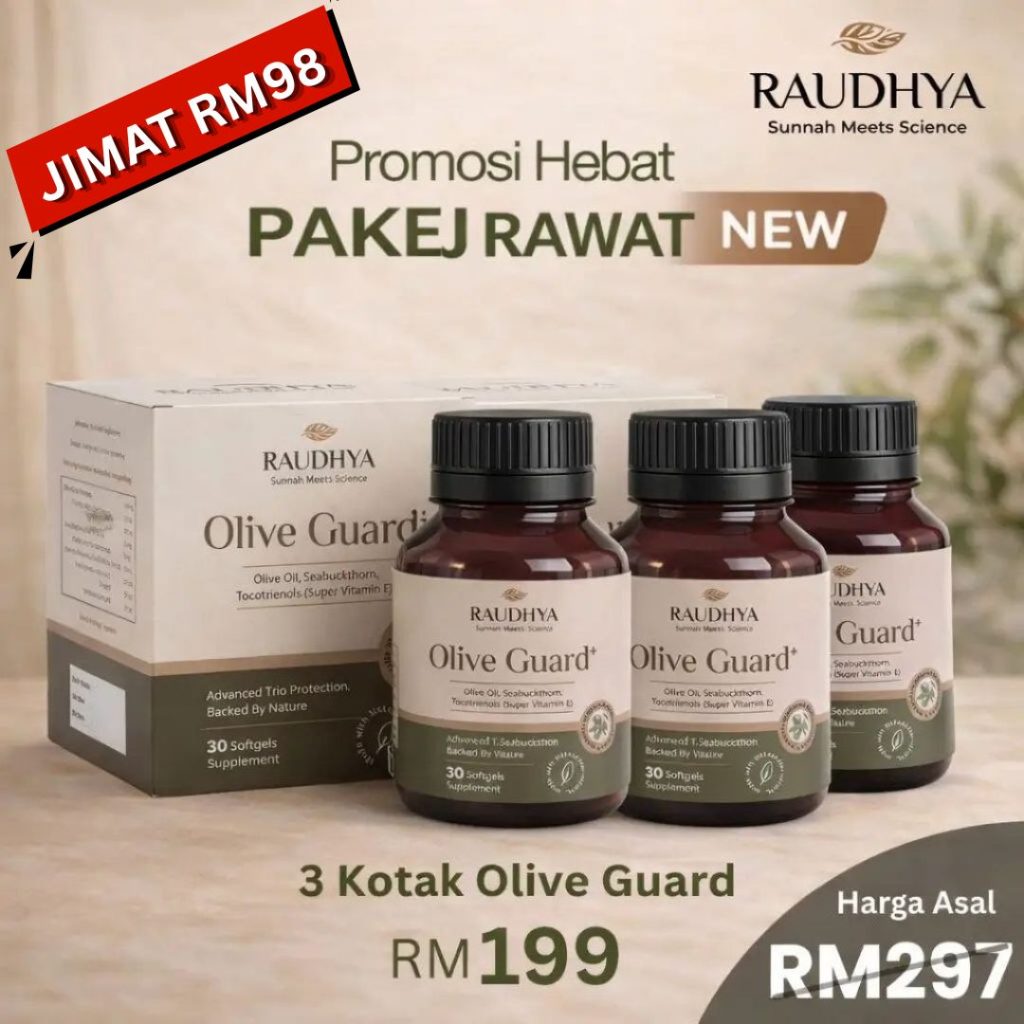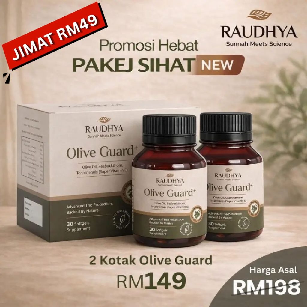 Raudhya OliveGuard+ Diperkaya Bahan Aktif Polyphenols, Tocotrienols (Super Vitamin E) & Omega Aktif Menyokong Kawalan Gula, Kolesterol & Tekanan Darah